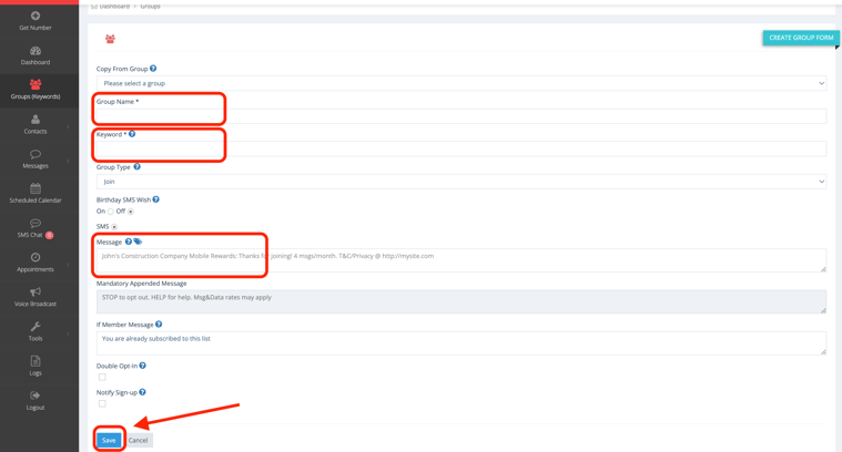 4. Next you will need to type in the "Group Name" you want, add in a "Keyword", add a "Message", and then click on "Save".